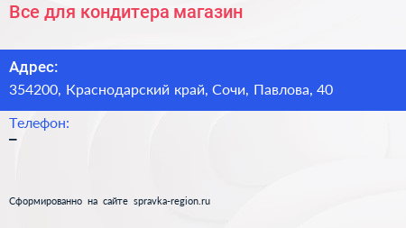 Все для кондитера, магазин по адресу 354200, Краснодарский край, Сочи, Павлова, 40 в дальнейшем Организация, размещена в следующих категориях: