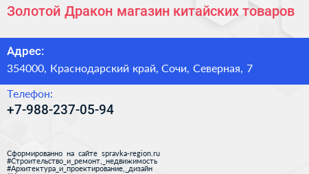 Золотой Дракон, магазин китайских товаров по адресу 354000, Краснодарский край, Сочи, Северная, 7 в дальнейшем Организация, размещена в следующих категориях: