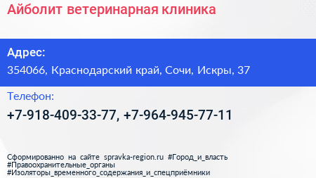 Айболит, ветеринарная клиника по адресу 354066, Краснодарский край, Сочи, Искры, 37 в дальнейшем Организация, размещена в следующих категориях: