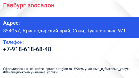 Гавбург, зоосалон по адресу 354057, Краснодарский край, Сочи, Туапсинская, 9/1 в дальнейшем Организация, размещена в следующих категориях: