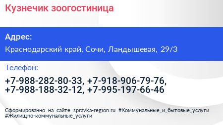 Кузнечик, зоогостиница по адресу Краснодарский край, Сочи, Ландышевая, 29/3 в дальнейшем Организация, размещена в следующих категориях:
