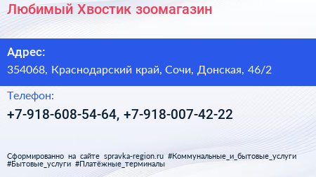Любимый Хвостик, зоомагазин по адресу 354068, Краснодарский край, Сочи, Донская, 46/2 в дальнейшем Организация, размещена в следующих категориях: