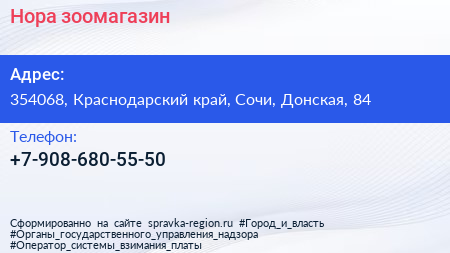 Нора, зоомагазин по адресу 354068, Краснодарский край, Сочи, Донская, 84 в дальнейшем Организация, размещена в следующих категориях: