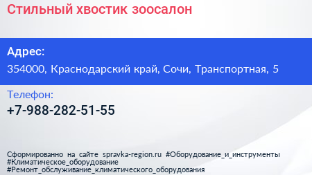 Стильный хвостик, зоосалон по адресу 354000, Краснодарский край, Сочи, Транспортная, 5 в дальнейшем Организация, размещена в следующих категориях: