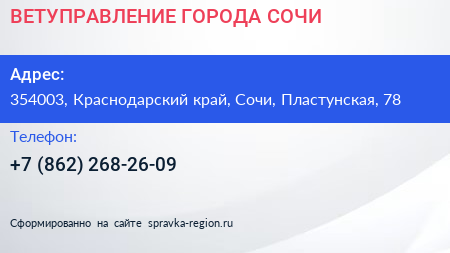 ВЕТУПРАВЛЕНИЕ ГОРОДА СОЧИ по адресу 354003, Краснодарский край, Сочи, Пластунская, 78 в дальнейшем Организация, размещена в следующих категориях: