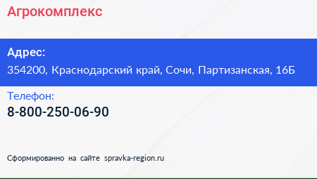 Агрокомплекс по адресу 354200, Краснодарский край, Сочи, Партизанская, 16Б в дальнейшем Организация, размещена в следующих категориях:
