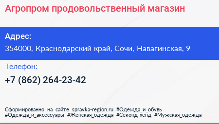 Агропром, продовольственный магазин по адресу 354000, Краснодарский край, Сочи, Навагинская, 9 в дальнейшем Организация, размещена в следующих категориях: