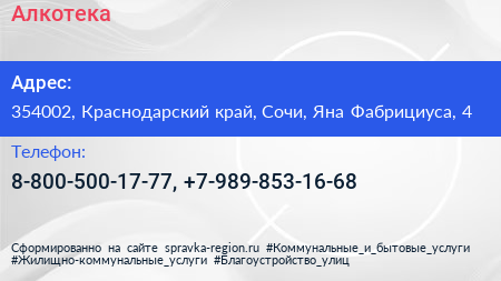 Алкотека по адресу 354002, Краснодарский край, Сочи, Яна Фабрициуса, 4 в дальнейшем Организация, размещена в следующих категориях:
