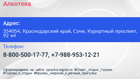 Алкотека по адресу 354054, Краснодарский край, Сочи, Курортный проспект, 92 к4 в дальнейшем Организация, размещена в следующих категориях: