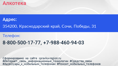 Алкотека по адресу 354200, Краснодарский край, Сочи, Победы, 31 в дальнейшем Организация, размещена в следующих категориях: