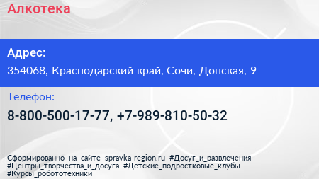 Алкотека по адресу 354068, Краснодарский край, Сочи, Донская, 9 в дальнейшем Организация, размещена в следующих категориях: