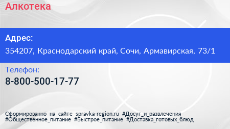 Алкотека по адресу 354207, Краснодарский край, Сочи, Армавирская, 73/1 в дальнейшем Организация, размещена в следующих категориях: