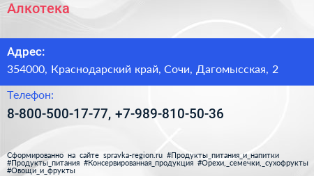 Алкотека по адресу 354000, Краснодарский край, Сочи, Дагомысская, 2 в дальнейшем Организация, размещена в следующих категориях: