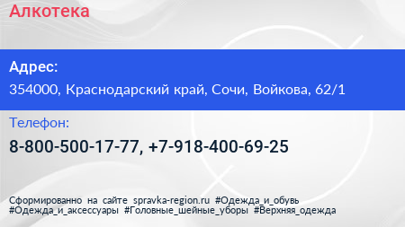 Алкотека по адресу 354000, Краснодарский край, Сочи, Войкова, 62/1 в дальнейшем Организация, размещена в следующих категориях: