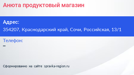 Анюта, продуктовый магазин по адресу 354207, Краснодарский край, Сочи, Российская, 13/1 в дальнейшем Организация, размещена в следующих категориях: