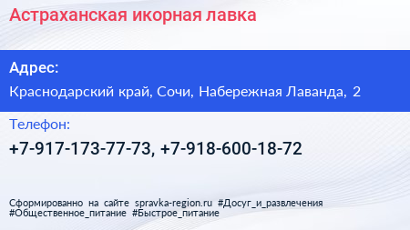 Астраханская икорная лавка по адресу Краснодарский край, Сочи, Набережная Лаванда, 2 в дальнейшем Организация, размещена в следующих категориях: