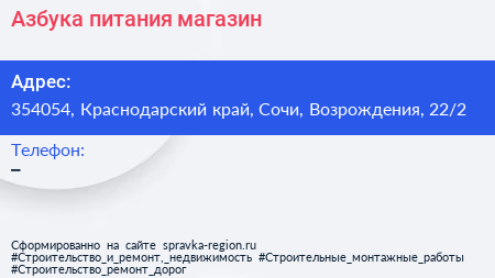 Азбука питания, магазин по адресу 354054, Краснодарский край, Сочи, Возрождения, 22/2 в дальнейшем Организация, размещена в следующих категориях:
