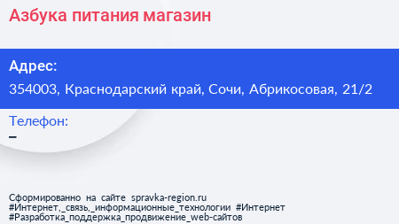 Азбука питания, магазин по адресу 354003, Краснодарский край, Сочи, Абрикосовая, 21/2 в дальнейшем Организация, размещена в следующих категориях:
