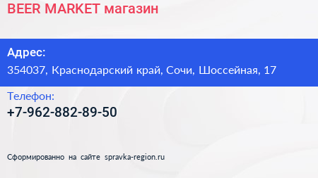 BEER MARKET, магазин по адресу 354037, Краснодарский край, Сочи, Шоссейная, 17 в дальнейшем Организация, размещена в следующих категориях: