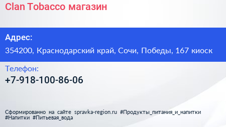 Clan Tobacco, магазин по адресу 354200, Краснодарский край, Сочи, Победы, 167 киоск в дальнейшем Организация, размещена в следующих категориях: