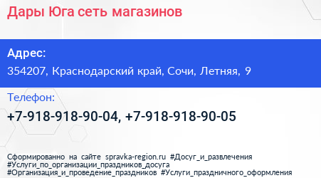 Дары Юга, сеть магазинов по адресу 354207, Краснодарский край, Сочи, Летняя, 9 в дальнейшем Организация, размещена в следующих категориях: