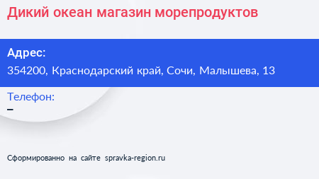 Дикий океан, магазин морепродуктов по адресу 354200, Краснодарский край, Сочи, Малышева, 13 в дальнейшем Организация, размещена в следующих категориях: