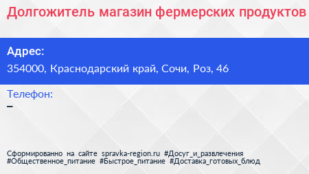Долгожитель, магазин фермерских продуктов по адресу 354000, Краснодарский край, Сочи, Роз, 46 в дальнейшем Организация, размещена в следующих категориях: