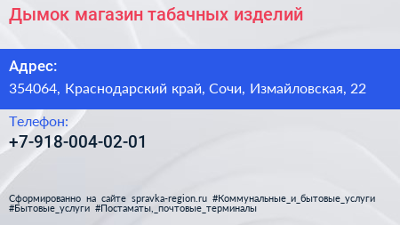 Дымок, магазин табачных изделий по адресу 354064, Краснодарский край, Сочи, Измайловская, 22 в дальнейшем Организация, размещена в следующих категориях: