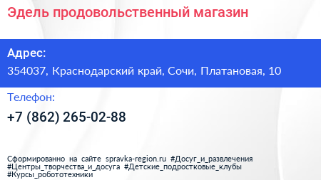 Эдель, продовольственный магазин по адресу 354037, Краснодарский край, Сочи, Платановая, 10 в дальнейшем Организация, размещена в следующих категориях: