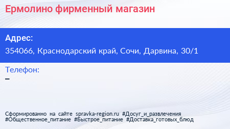 Ермолино, фирменный магазин по адресу 354066, Краснодарский край, Сочи, Дарвина, 30/1 в дальнейшем Организация, размещена в следующих категориях: