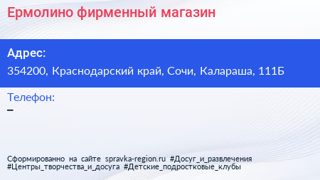 Ермолино, фирменный магазин по адресу 354200, Краснодарский край, Сочи, Калараша, 111Б в дальнейшем Организация, размещена в следующих категориях: