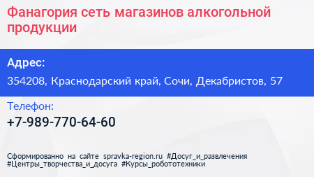 Фанагория, сеть магазинов алкогольной продукции по адресу 354208, Краснодарский край, Сочи, Декабристов, 57 в дальнейшем Организация, размещена в следующих категориях:
