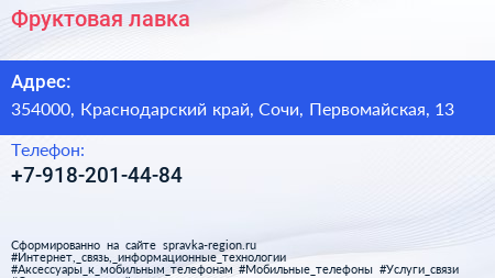 Фруктовая лавка по адресу 354000, Краснодарский край, Сочи, Первомайская, 13 в дальнейшем Организация, размещена в следующих категориях: