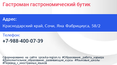 Гастроман, гастрономический бутик по адресу Краснодарский край, Сочи, Яна Фабрициуса, 58/2 в дальнейшем Организация, размещена в следующих категориях:
