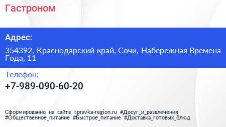 Гастроном по адресу 354392, Краснодарский край, Сочи, Набережная Времена Года, 11 в дальнейшем Организация, размещена в следующих категориях:
