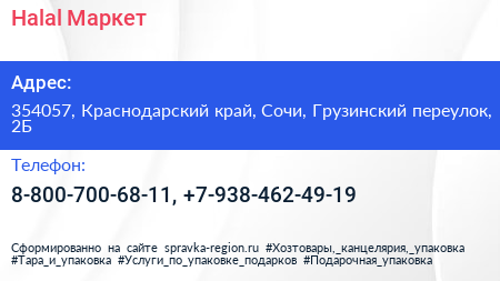 Halal Маркет по адресу 354057, Краснодарский край, Сочи, Грузинский переулок, 2Б в дальнейшем Организация, размещена в следующих категориях: