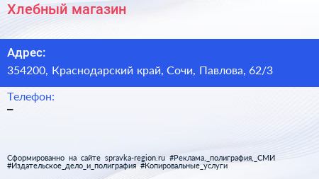 Хлебный магазин по адресу 354200, Краснодарский край, Сочи, Павлова, 62/3 в дальнейшем Организация, размещена в следующих категориях: