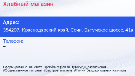 Хлебный магазин по адресу 354207, Краснодарский край, Сочи, Батумское шоссе, 41а в дальнейшем Организация, размещена в следующих категориях: