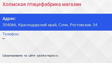 Холмская птицефабрика, магазин по адресу 354066, Краснодарский край, Сочи, Ростовская, 14 в дальнейшем Организация, размещена в следующих категориях: