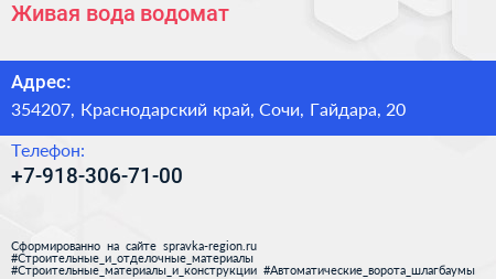 Живая вода, водомат по адресу 354207, Краснодарский край, Сочи, Гайдара, 20 в дальнейшем Организация, размещена в следующих категориях: