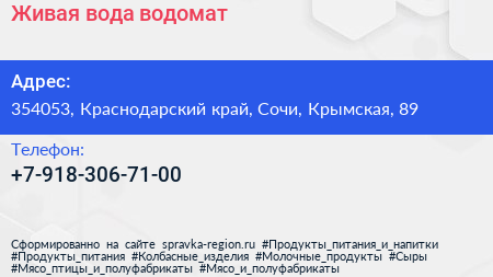 Живая вода, водомат по адресу 354053, Краснодарский край, Сочи, Крымская, 89 в дальнейшем Организация, размещена в следующих категориях: