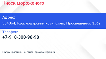 Киоск мороженого по адресу 354364, Краснодарский край, Сочи, Просвещения, 156в в дальнейшем Организация, размещена в следующих категориях: