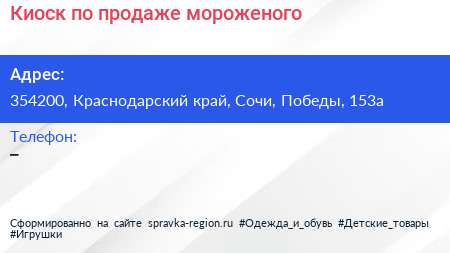 Киоск по продаже мороженого по адресу 354200, Краснодарский край, Сочи, Победы, 153а в дальнейшем Организация, размещена в следующих категориях: