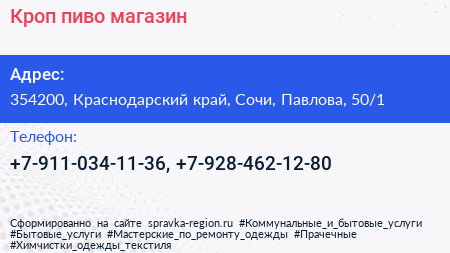Кроп-пиво, магазин по адресу 354200, Краснодарский край, Сочи, Павлова, 50/1 в дальнейшем Организация, размещена в следующих категориях: