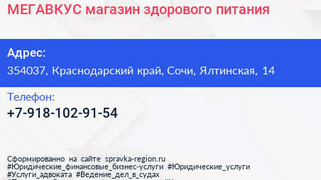 МЕГАВКУС, магазин здорового питания по адресу 354037, Краснодарский край, Сочи, Ялтинская, 14 в дальнейшем Организация, размещена в следующих категориях: