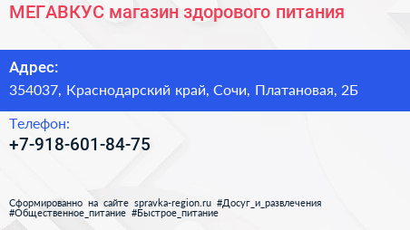 МЕГАВКУС, магазин здорового питания по адресу 354037, Краснодарский край, Сочи, Платановая, 2Б в дальнейшем Организация, размещена в следующих категориях: