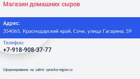 Магазин домашних сыров по адресу 354065, Краснодарский край, Сочи, улица Гагарина, 59 в дальнейшем Организация, размещена в следующих категориях: