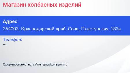 Магазин колбасных изделий по адресу 354003, Краснодарский край, Сочи, Пластунская, 183а в дальнейшем Организация, размещена в следующих категориях: