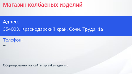 Магазин колбасных изделий по адресу 354003, Краснодарский край, Сочи, Труда, 1а в дальнейшем Организация, размещена в следующих категориях: