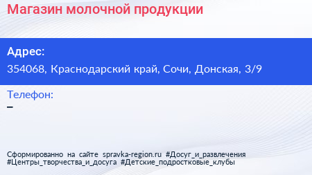Магазин молочной продукции по адресу 354068, Краснодарский край, Сочи, Донская, 3/9 в дальнейшем Организация, размещена в следующих категориях: